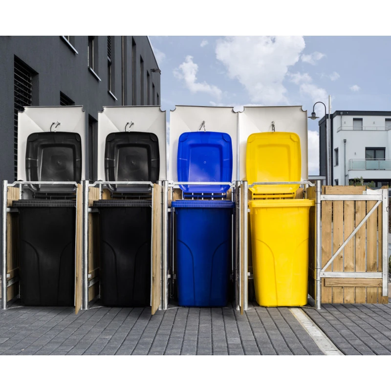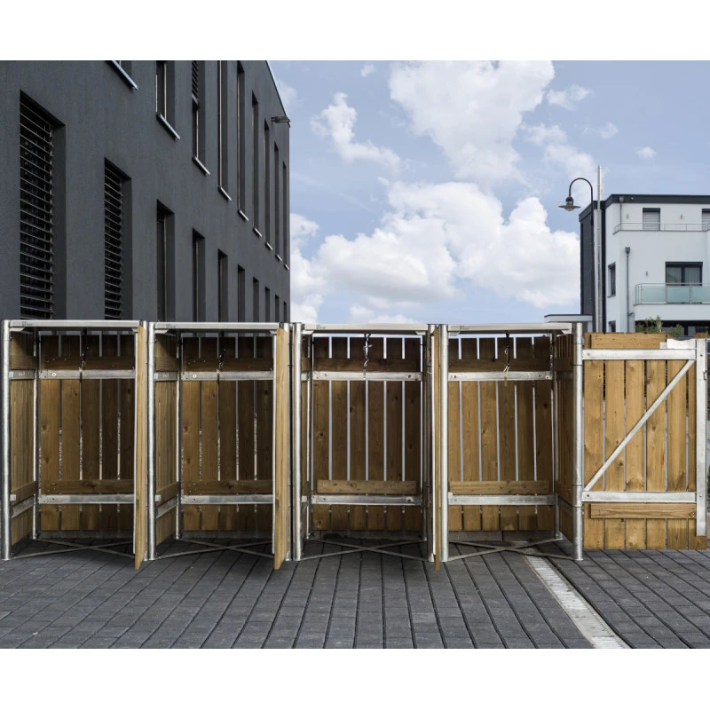 Ce modèle est prévu pour une utilisation en extérieur, il ne craint pas les intempéries et ne demande aucun entretien spécifique. Chaque compartiment est muni d’un portillon ouvrable sur la face avant et d’un couvercle avec crochet et cordelette pour une ouverture automatique de votre conteneur à déchets.