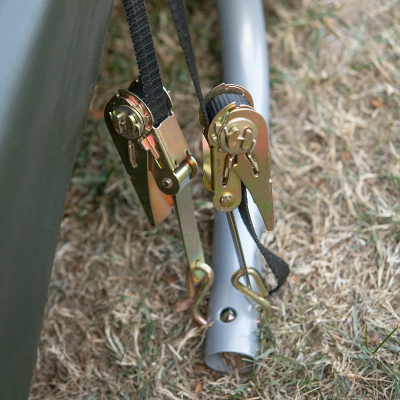 La toile est maintenue en place solidement grâce aux sangles d’arrimage à cliquet qui se fixent sur la structure. Pour une tension optimale de la toile, le système de traverses coulissantes se verrouille et positionne la structure pour qu’elle demeure parfaitement ajustée à la bâche. Cet abri démontable s’installe rapidement et ne requiert aucun outillage spécifique. Il peut être utilisé de manière saisonnière ou tout au long de l’année. L’installation doit se faire sur un sol relativement nivelé avec les 4 pieds d’ancrage fournis.